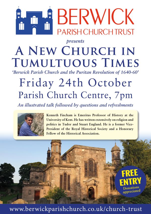 The construction of Berwick Parish Church began in 1650, and as part of the events to celebrate its 375th anniversary, an illustrated talk will be given by Professor Kenneth Fincham of the University of Kent in the Parish Centre on Friday 24th October 2025 at 7:00pm. The talk is entitled “A New Church in Tumultuous Times – Berwick Parish Church and the Puritan Revolution of 1640-60”.