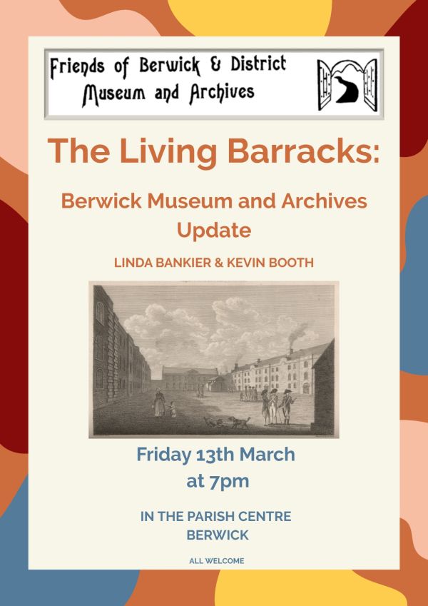 The Friends’ Spring lecture will be “The Living Barracks: a Museum and Archives update”. It will take place on Friday 13th March 2026 at 7.00pm in the Parish Centre (Parade, Berwick). Kevin Booth (Head of Collections, English Heritage) and Linda Bankier (Berwick Archivist) will discuss the work which has been taking place in preparation for the opening of new Museum and Archives services in the Barracks. They will focus on some of the discoveries and surprises which have come to light in the course of the work.